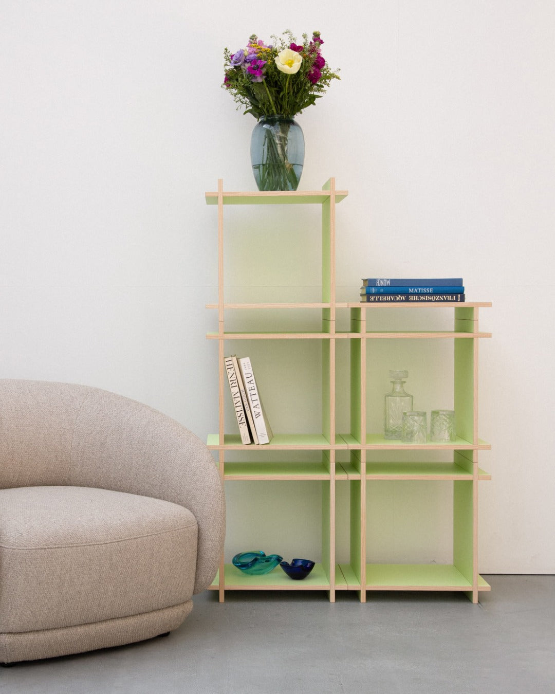 Two elements: Cubes & Caps. Invisibly connected by magnets. Designed for shelves, room dividers, sideboards, or bedside tables – modular, stable, timeless.