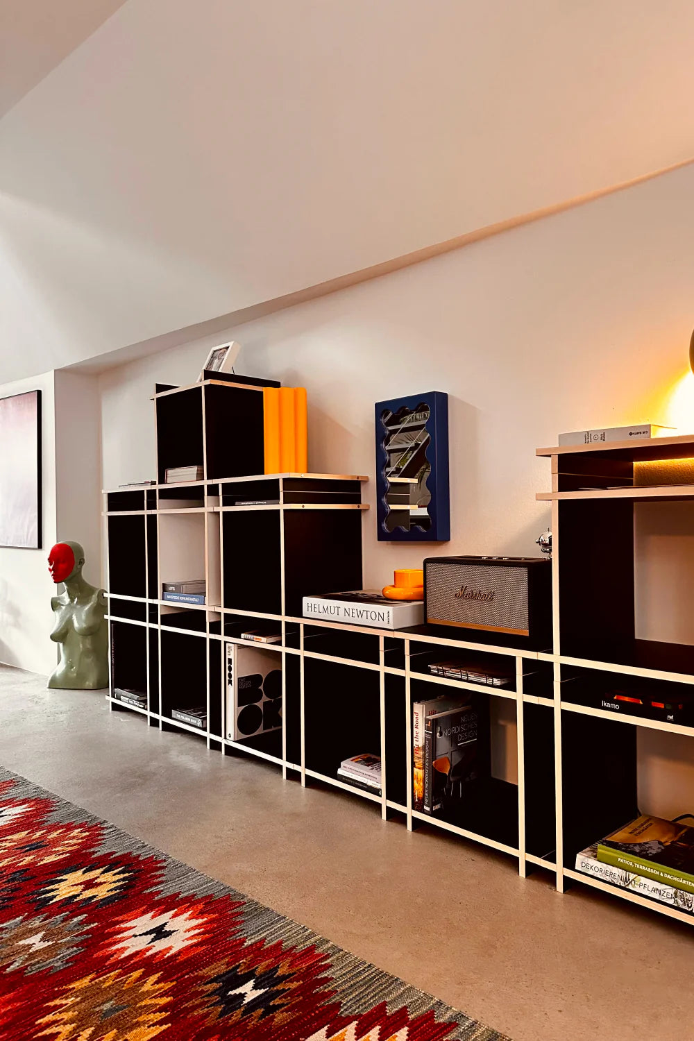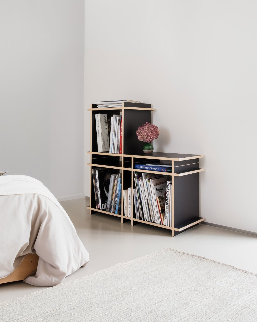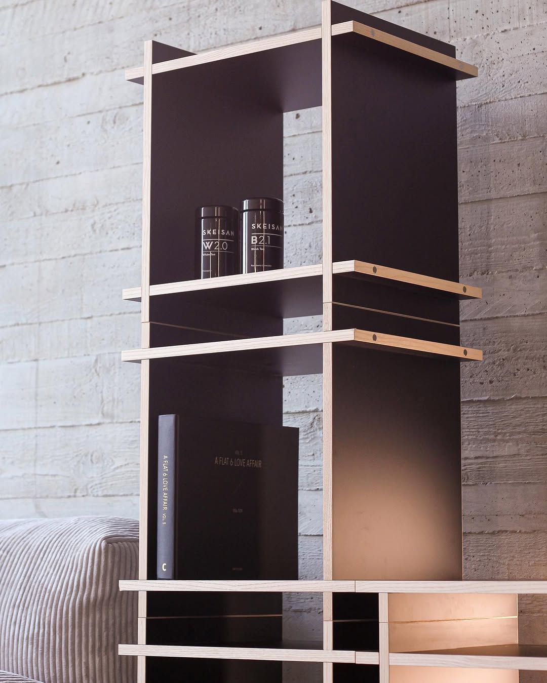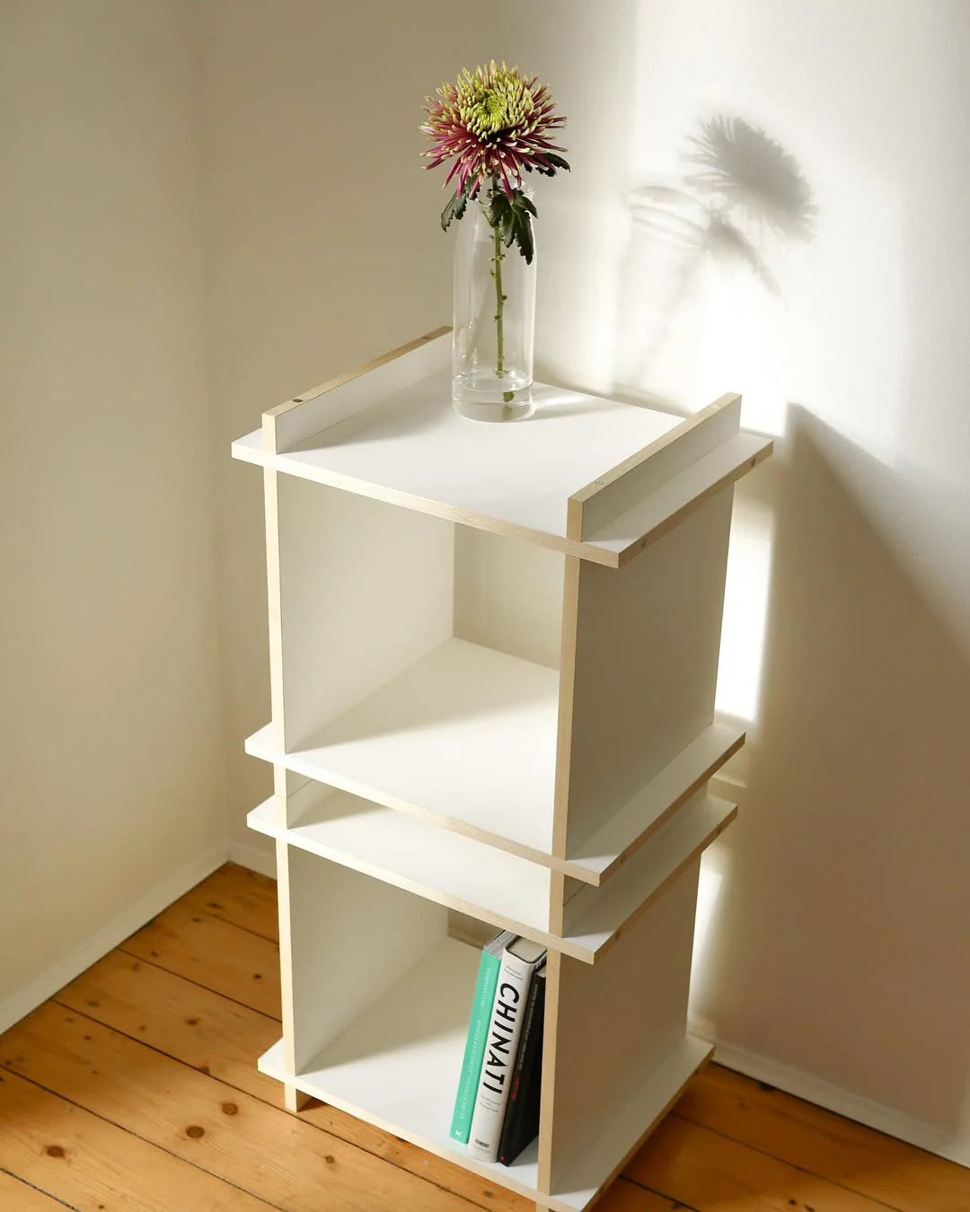 Two elements: Cubes & Caps. Invisibly connected by magnets. Designed for shelves, room dividers, sideboards, or bedside tables – modular, stable, timeless.